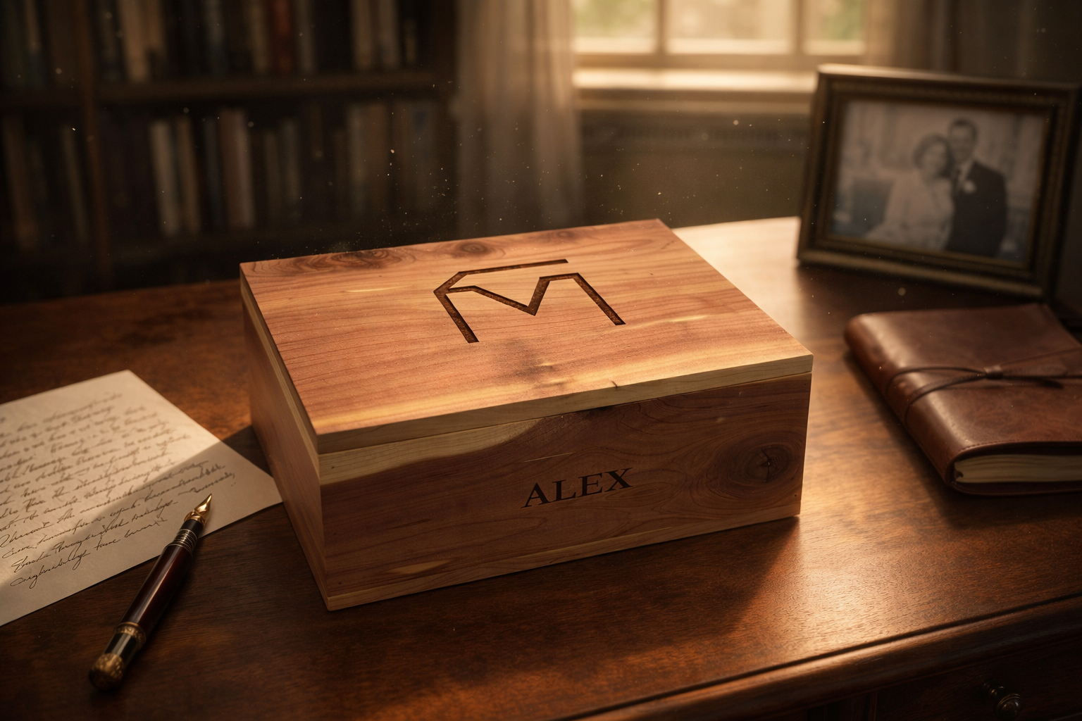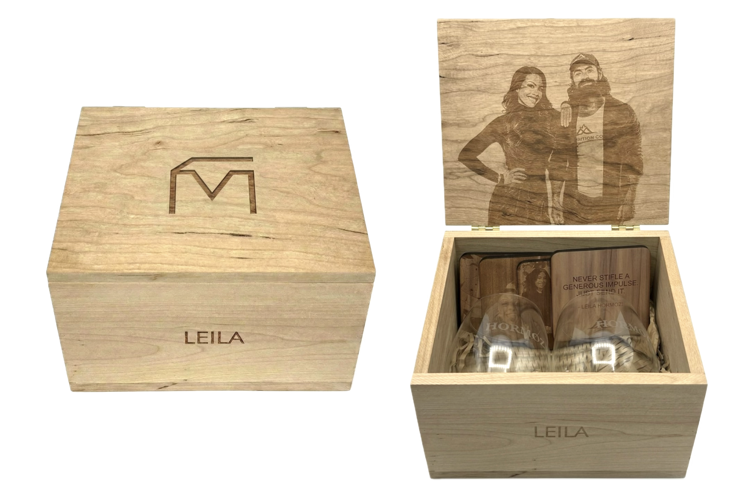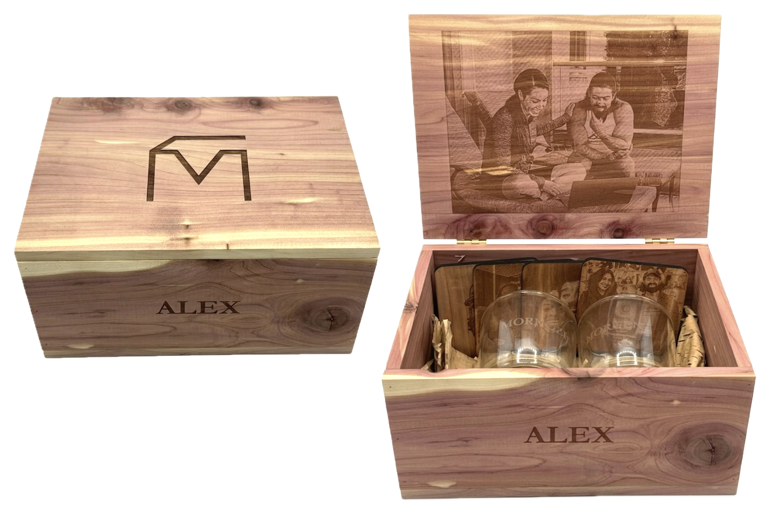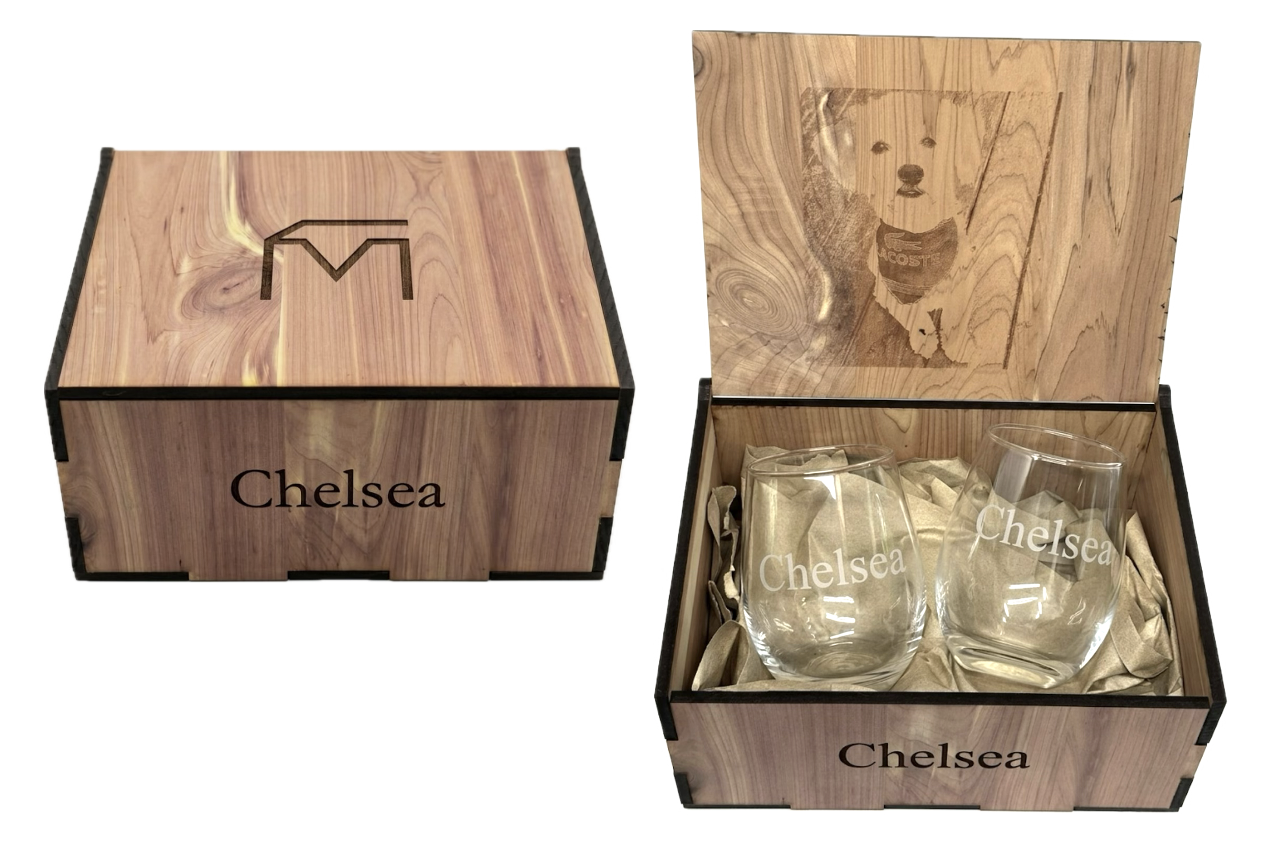 8 × 7 × 4 in • Musser crest comes standard on top lid • Box price shown - add gifts at checkout